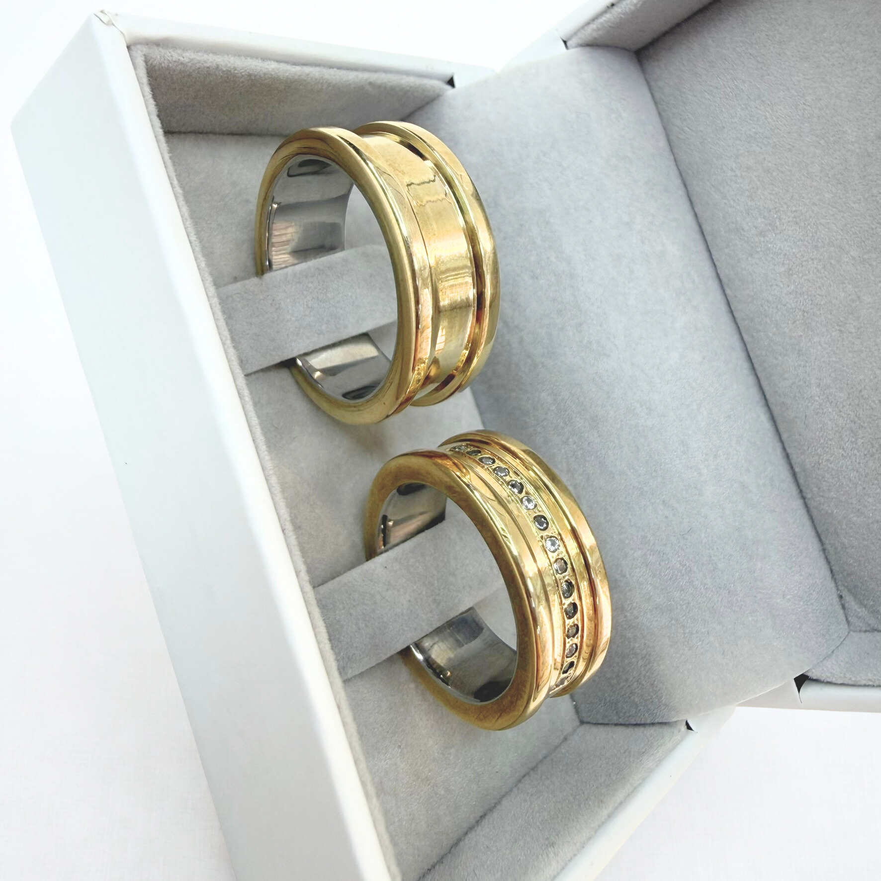 Par de Alianças Bvulgari 8mm em Moeda Antiga 15 pedras meia volta